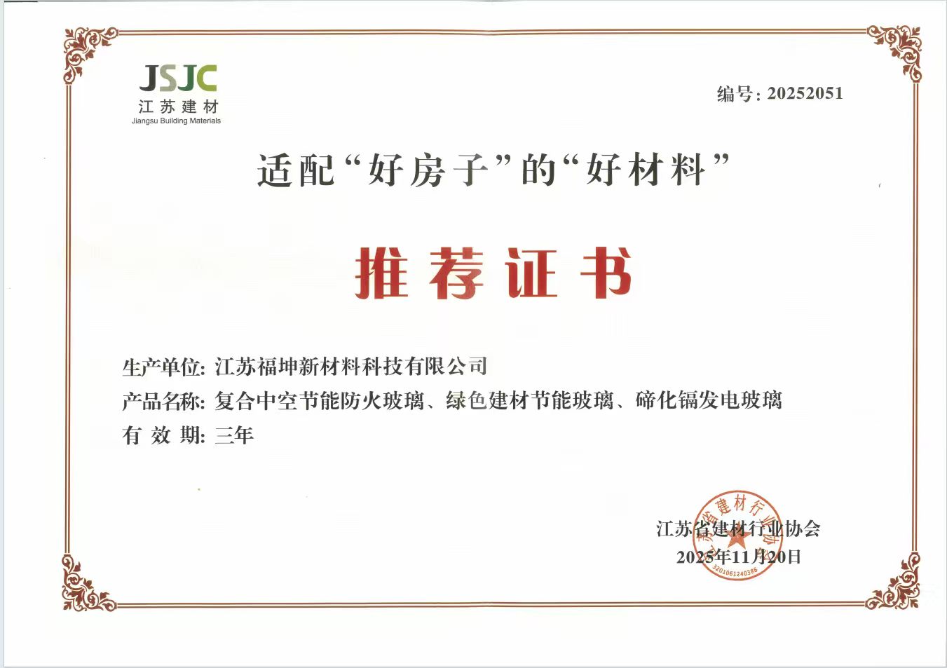 江蘇福坤新材料科技有限公司始創(chuàng)于2007年,總部設(shè)在江蘇省泰興市城區(qū)工業(yè)園莊基路1號,是蘇中地區(qū)玻璃深加工行業(yè)最具競爭力的企業(yè)之一。 近年來公司產(chǎn)品通過了CQC中國質(zhì)量認(rèn)證中心3C認(rèn)證、ISO9001:2008質(zhì)量體系認(rèn)證、美國SGCC安全認(rèn)證、澳洲STA標(biāo)準(zhǔn)認(rèn)證、綠色工廠認(rèn)證等。目前公司有18項(xiàng)技術(shù)和產(chǎn)品獲得了國家專利,有3種產(chǎn)品獲得了國家節(jié)能產(chǎn)品認(rèn)證。…